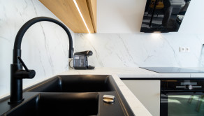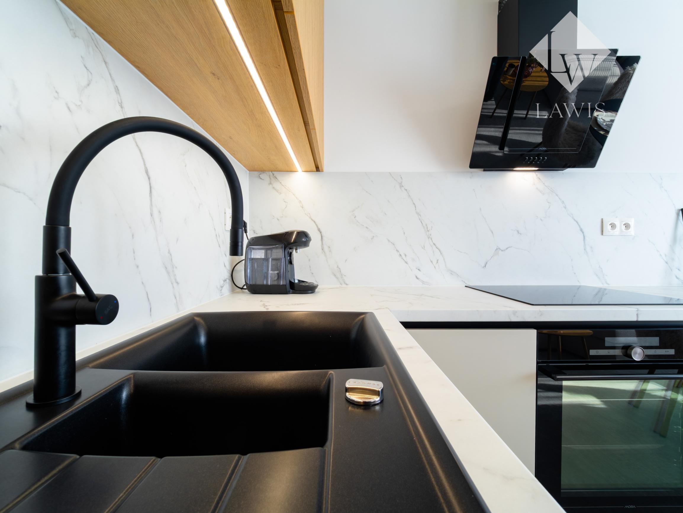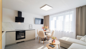Kuchyňa spojená s obývačkou: kuchynská linka na mieru s novými spotrebičmi (indukčná varná platňa s multizónami, digestor, elektrická rúra, chladnička s mrazničkou, umývačka), sedacia súprava, konferenčný stolík, jedálenský stôl s 3 stoličkami, TV.