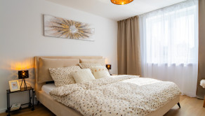Spálňa 1: nová manželská posteľ s novým matracom, nočné stolíky, nočné lampy, stojace svietidlo, stolička.