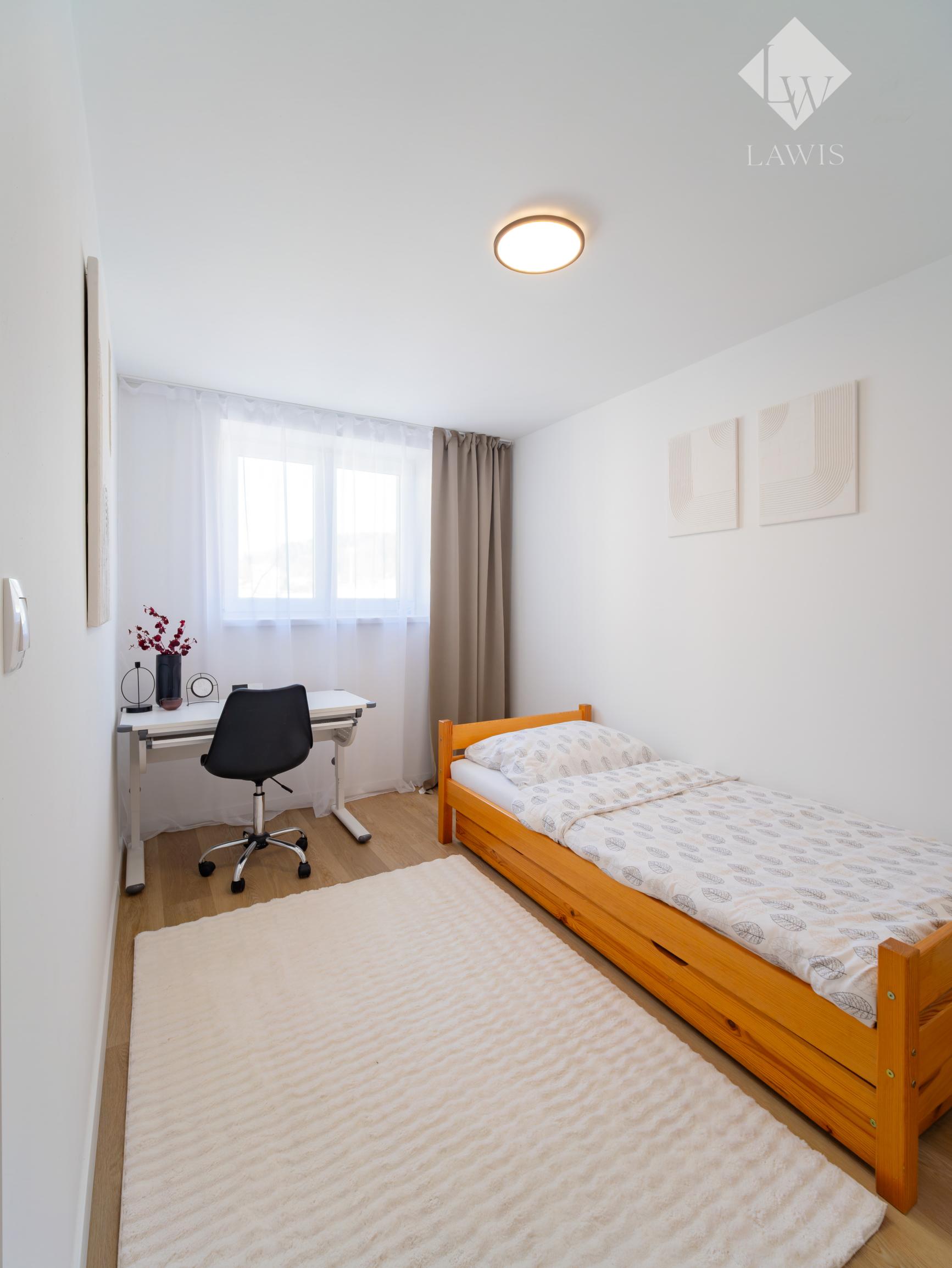 Spálňa 2: posteľ s matracom, študetský stôl so stoličkou.