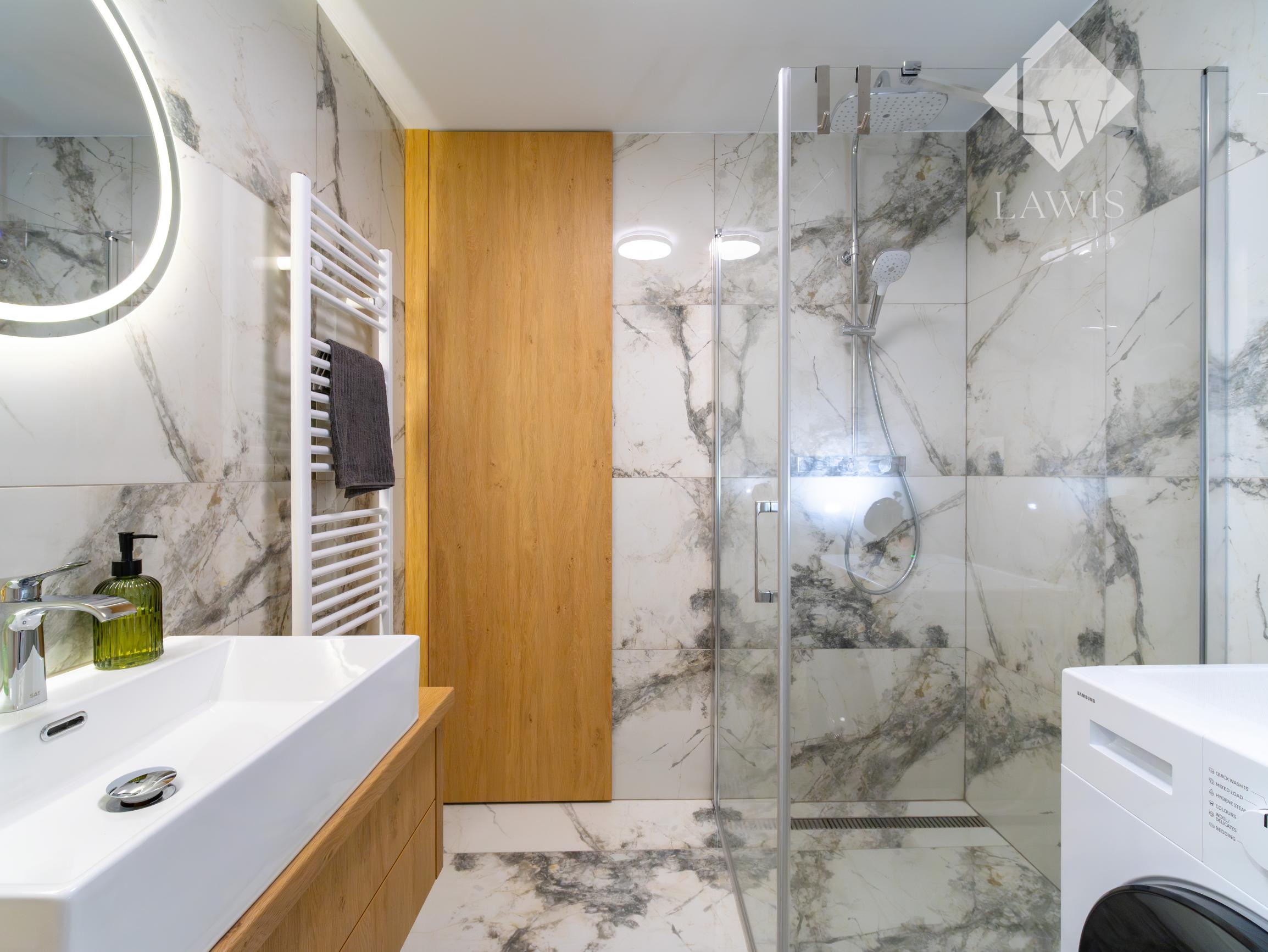 Kúpeľňa: sprchový kút, umývadlo, práčka.
